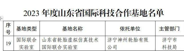 近日,山东省科技厅下发《关于认定2023年度山东省国际科技合作基地的通知》,济宁神州轮胎有限公司申报的山东省轮胎虚拟仿真技术国际联合实验室成功获批2023年度山东省国际科技合作基地。
