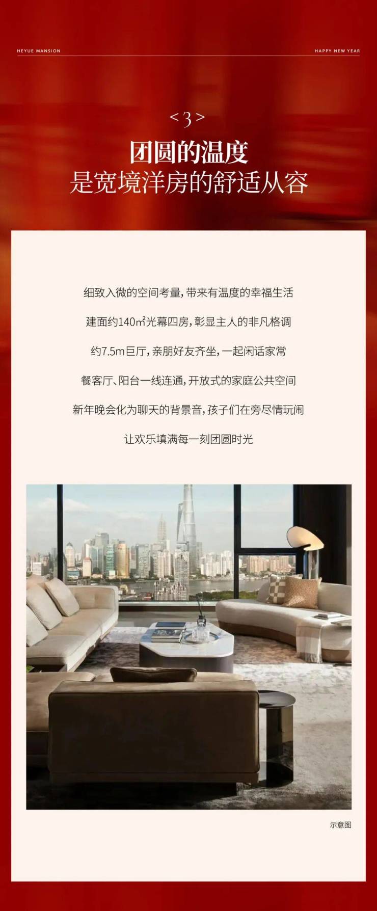 中垠·和悦府细致入微的空间考量,带来有温度的幸福生活。建面约140㎡光幕四房,彰显主人的非凡格调。约7.5m巨厅,亲朋好友齐坐,一起闲话家常。餐客厅、阳台一线连通,开放式的家庭公共空间。新年晚会化为聊天的背景音,孩子们在旁尽情玩闹让欢乐填满每一刻团