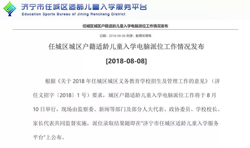 现场将由纪检、监察、新闻、公证等部门及部分人大代表、政协委员、学校校长、家长代表等共同监督,派位录取结果随即在任城区适龄儿童入学服务平台公布。