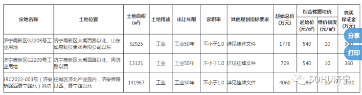 土地位于:济宁高新区大禹西路以北、山东如意科技集团有限公司以东;土地面积:32925㎡(约49亩);土地用途:工业用地;出让年限:50年;容积率不小于1.0;起始价:1778万元,综合楼面价起价:540元/㎡;最终成交价为:1778万元(约36万元/亩),综合楼面地价成交价:540元/㎡;溢价率:0.0%;