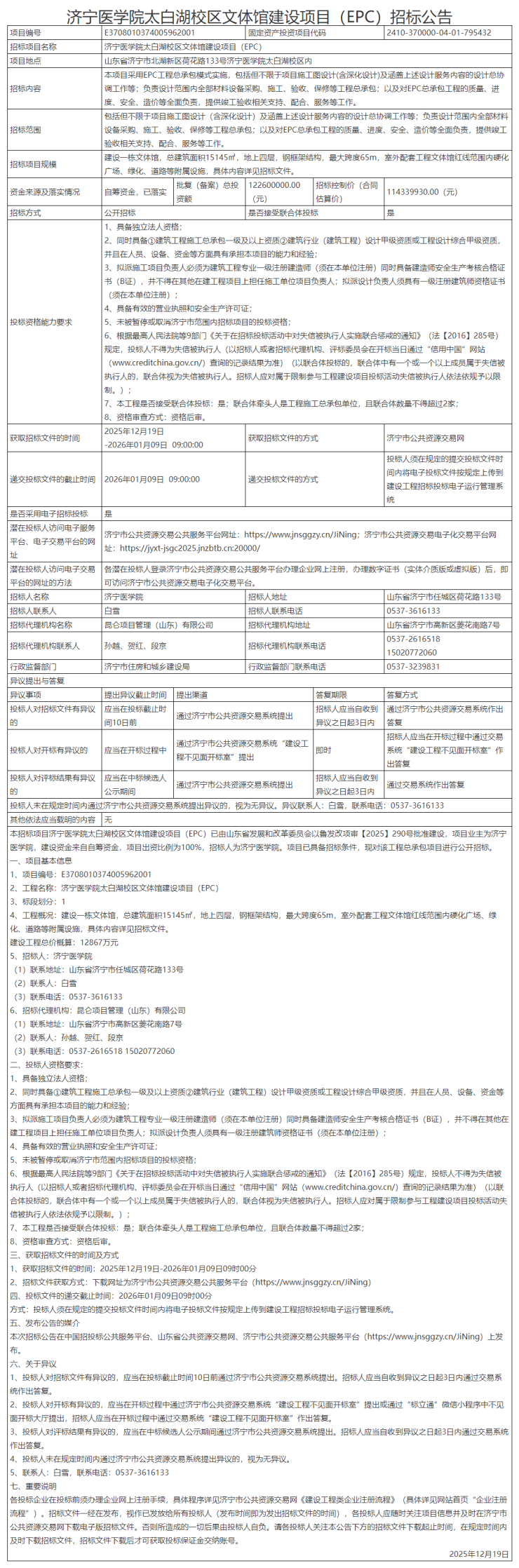 本招标项目济宁医学院太白湖校区文体馆建设项目(EPC)已由山东省发展和改革委员会以鲁发改项审【2025】290号批准建设,项目业主为济宁医学院,建设资金来自自筹资金,项目出资比例为100%,招标人为济宁医学院。项目已具备招标条件,现对该工程总承包项目进行公开招标。