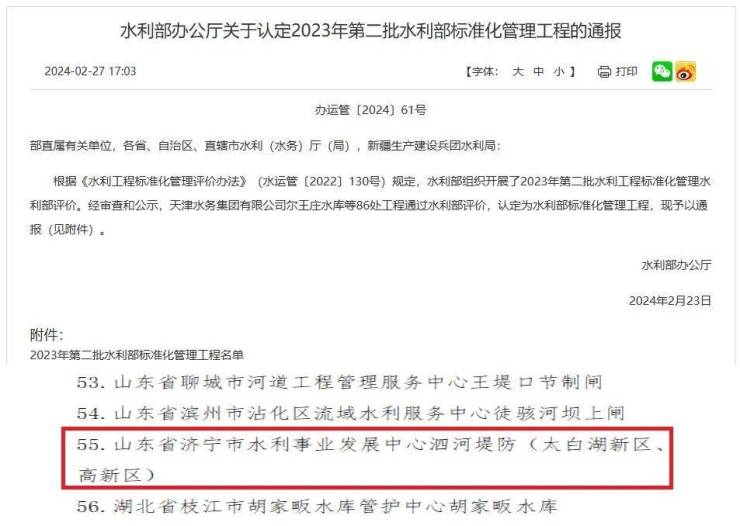 搜狐网济宁小编了解到:近日,水利部官方网站发布了《水利部办公厅关于认定2023年第二批水利部标准化管理工程的通报》,其中泗河堤防(太白湖新区段)获此殊荣,成为我省第一个也是唯一的国家级堤防类水利工程标准化管理工程。