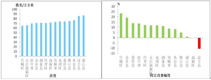可吸入颗粒物(PM10)浓度较好的县(市、区)是任城区,为65微克/立方米;最差的是梁山县,为87微克/立方米;14县(市、区)同比改善幅度较大的是任城区,为改善23.5%;最小的是汶上县,为恶化10.3%。