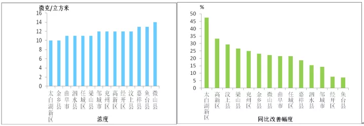 二氧化氮(NO2)浓度较好的县(市、区)是金乡县,为20微克/立方米;最差的是兖州区,为32微克/立方米;14县(市、区)同比改善幅度较大的是太白湖新区,为改善22.6%,最小的是泗水县,为改善3.6%。