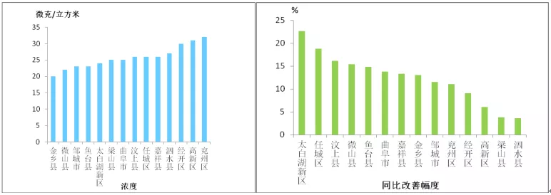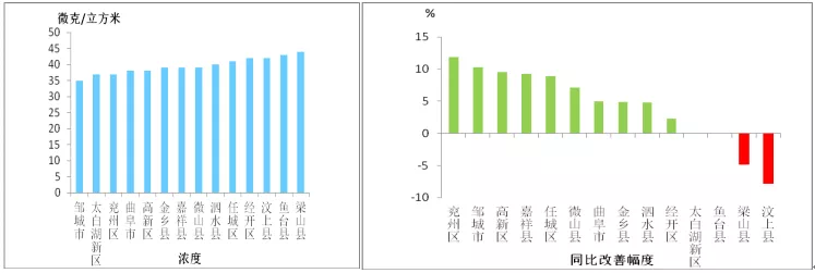 细颗粒物(PM2.5)较好的县(市、区)是邹城市,为35微克/立方米;最差的是梁山县,为44微克/立方米;14县(市、区)同比改善幅度较大的是兖州区,为改善11.9%,最小的是汶上县,为恶化7.7%。