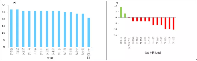 优良天最多的县(市、区)是邹城市、嘉祥县,均为27天;最少的是太白湖新区,为21天;同比优良天增幅最多的是太白湖新区,为增加5天,最少的是高新区、鱼台县,均为减少3天;优良率同比改善幅度较大的是泗水县,为增加9个百分点,最小的是经开区,为下降10.3个百分点。