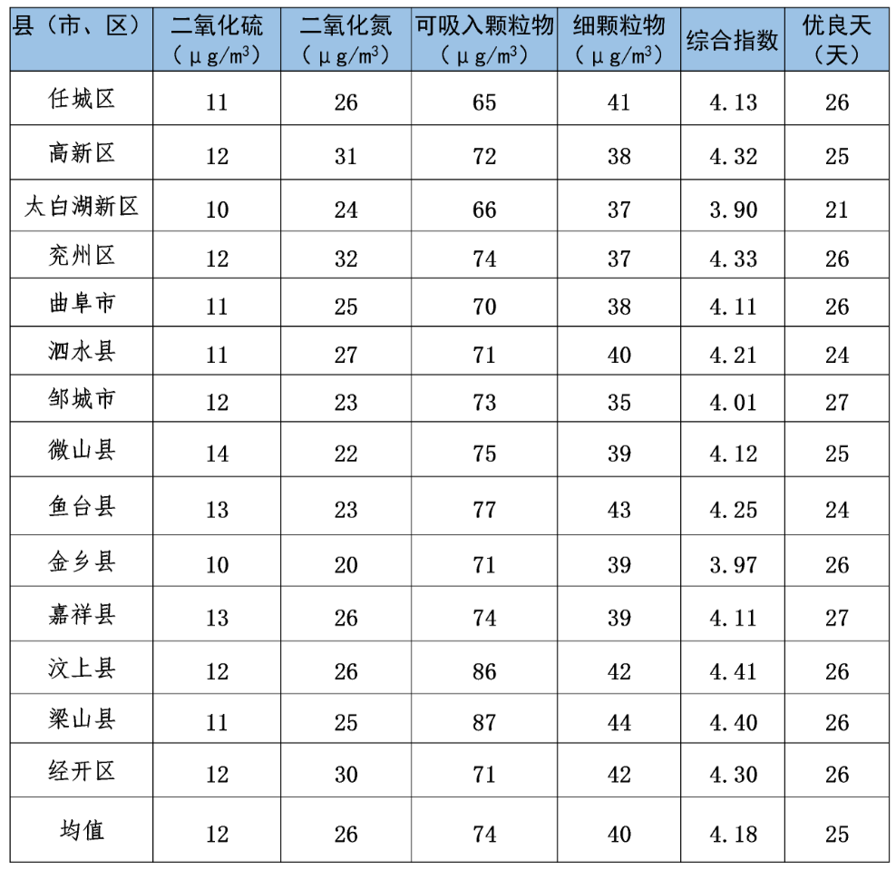 根据环境空气质量自动监测数据,济宁市对4月份环境空气质量状况及14县市区排名公布。