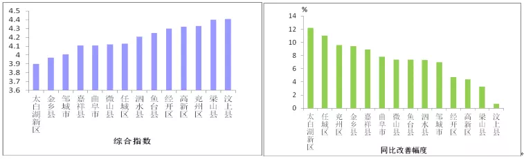 环境空气质量综合指数较好的县(市、区)是太白湖新区,为3.90;最差的是汶上县,为4.41;14县(市、区)同比改善幅度较大的是太白湖新区,为改善12.2%,最小的是汶上县,为改善0.7%。