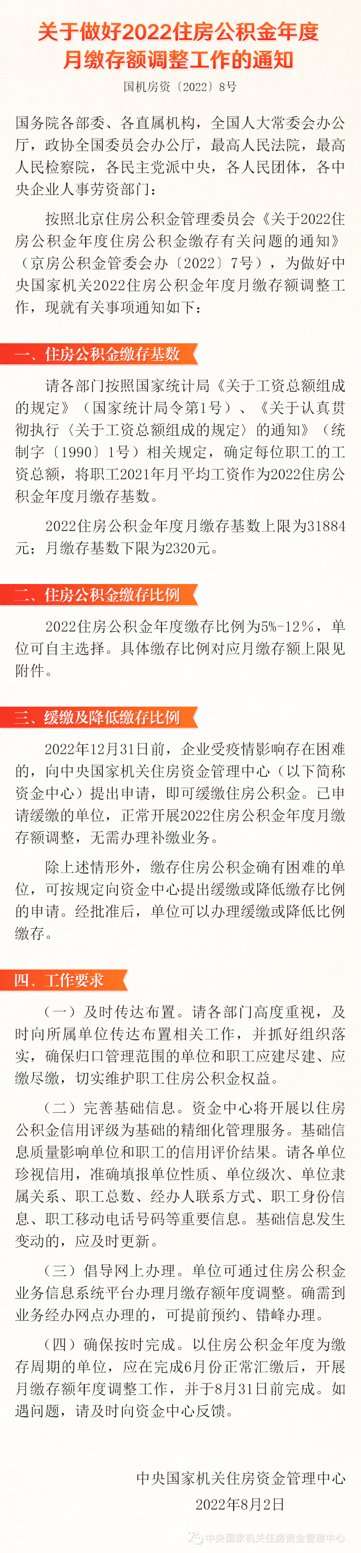 8月3日,中央国家机关住房资金管理中心发布关于做好2022住房公积金年度月缴存额调整工作的通知,确定每位职工的工资总额,将职工2021年月平均工资作为2022住房公积金年度月缴存基数。 2022住房公积金年度月缴存基数上限为31884元;月缴存基数下限为2320元。