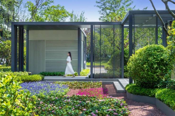 通透玻璃搭配精细栏杆,引阳光轻风入室,日月星云、晨昏四季,于精致立面恣意游走,构成一幅四时不同的自然画卷,居于此间,将光影与园林风景悉数珍藏。