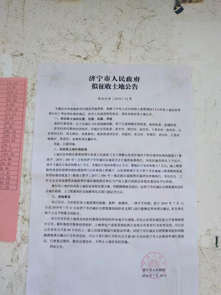 拟于2019年7月11日至2019年7月31日由济宁市任城区自然资源局组织有关部门进行勘测定界和清点确认,有关单位和个人应予积极支持配合。