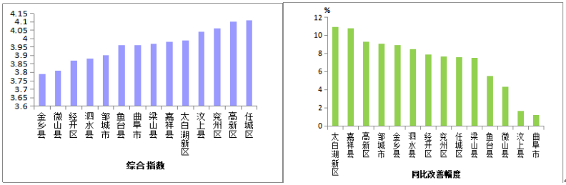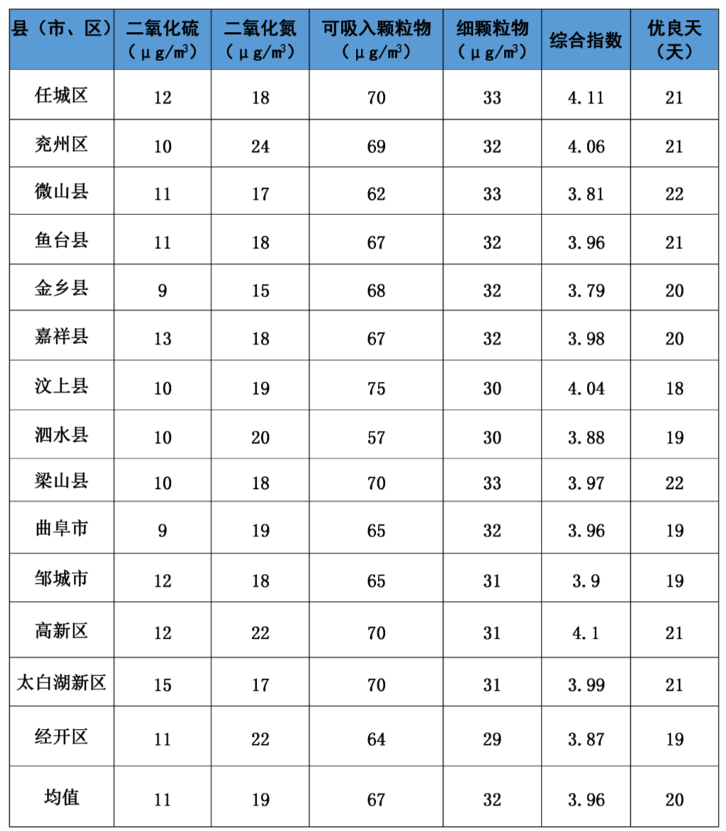环境空气质量综合指数较好的县(市、区)是金乡县,为3.79;最差的是任城区,为4.11;14县(市、区)同比改善幅度较大的是太白湖新区,为改善10.9%,最小的是曲阜市,为改善1.2%。