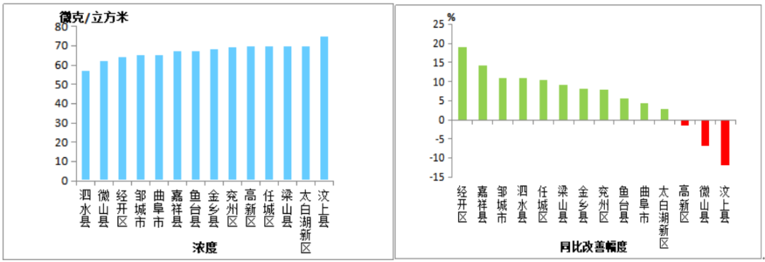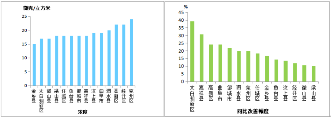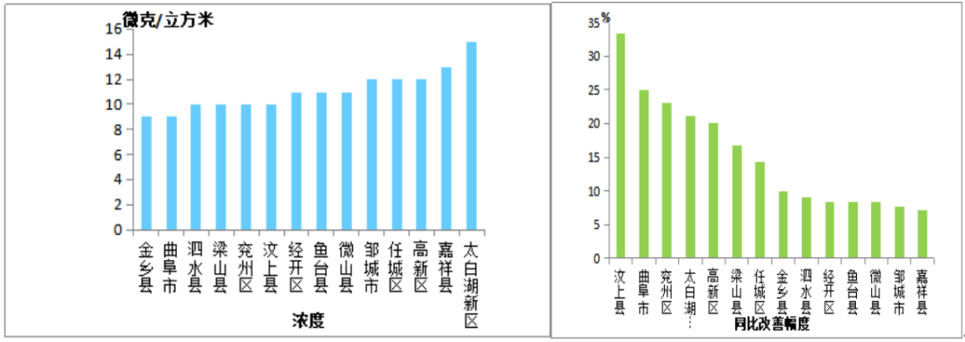 二氧化氮(NO2)浓度较好的县(市、区)是金乡县,为15微克/立方米;最差的是兖州区,为24微克/立方米;14县(市、区)同比改善幅度较大的是太白湖新区,为改善39.3%,最小的是梁山县,为改善10.0%。