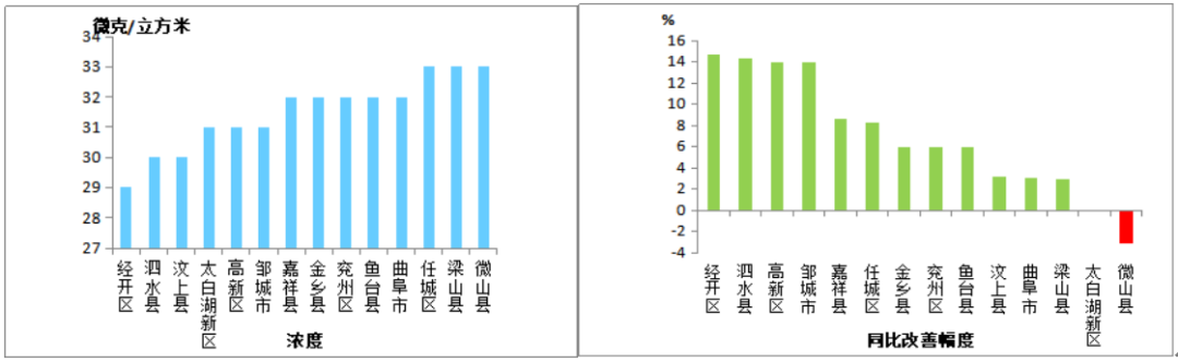 细颗粒物(PM2.5)较好的县(市、区)是经开区,为29微克/立方米;最差的是任城区、梁山县、微山县,均为33微克/立方米;14县(市、区)同比改善幅度较大的是经开区,为改善14.7%,最小的是微山县,为恶化3.1%。