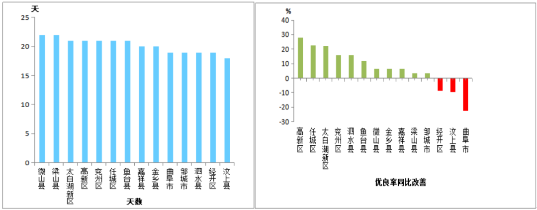 优良天最多的县(市、区)是微山县、梁山县,均为22天;最少的是汶上县,为18天;14个县(市、区)同比优良天增幅最多的是太白湖新区,为增加9天,最少的是曲阜市,为减少7天;14县(市、区)优良率同比改善幅度较大的是高新区,为增加28.1个百分点,最小的是曲阜市,为下降22.6个百分点。