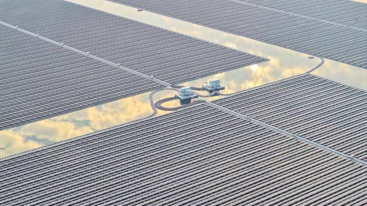 初夏阳光普照,在山东省济宁市兖州区采煤沉陷区的湖面上,时代绿能兖州光伏电站的数十万块光伏板,源源不断地将太阳能转化为电能。