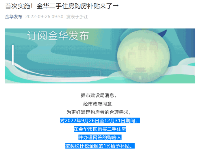 同日,“金华发布”公众号发布消息称,对2022年9月26日至12月31日期间,在金华市区购买二手住房并办理网签的购房人按契税计税金额的1%给予补贴。