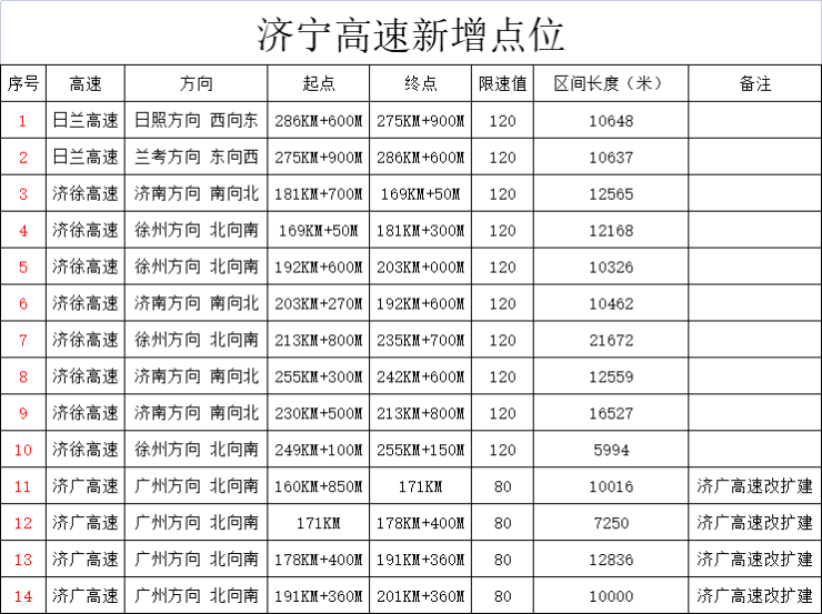 为进一步加强高速公路交通安全管理,规范行车秩序,预防和减少道路交通事故发生,依据《中华人民共和国道路交通安全法》《中华人民共和国道路交通安全法实施条例》《山东省高速公路设置应用区间测速指导意见》等法律法规及规定,济宁市公安局高速公路交通警察支队拟在辖区新增14处区间测速取证设备,现予以公示: