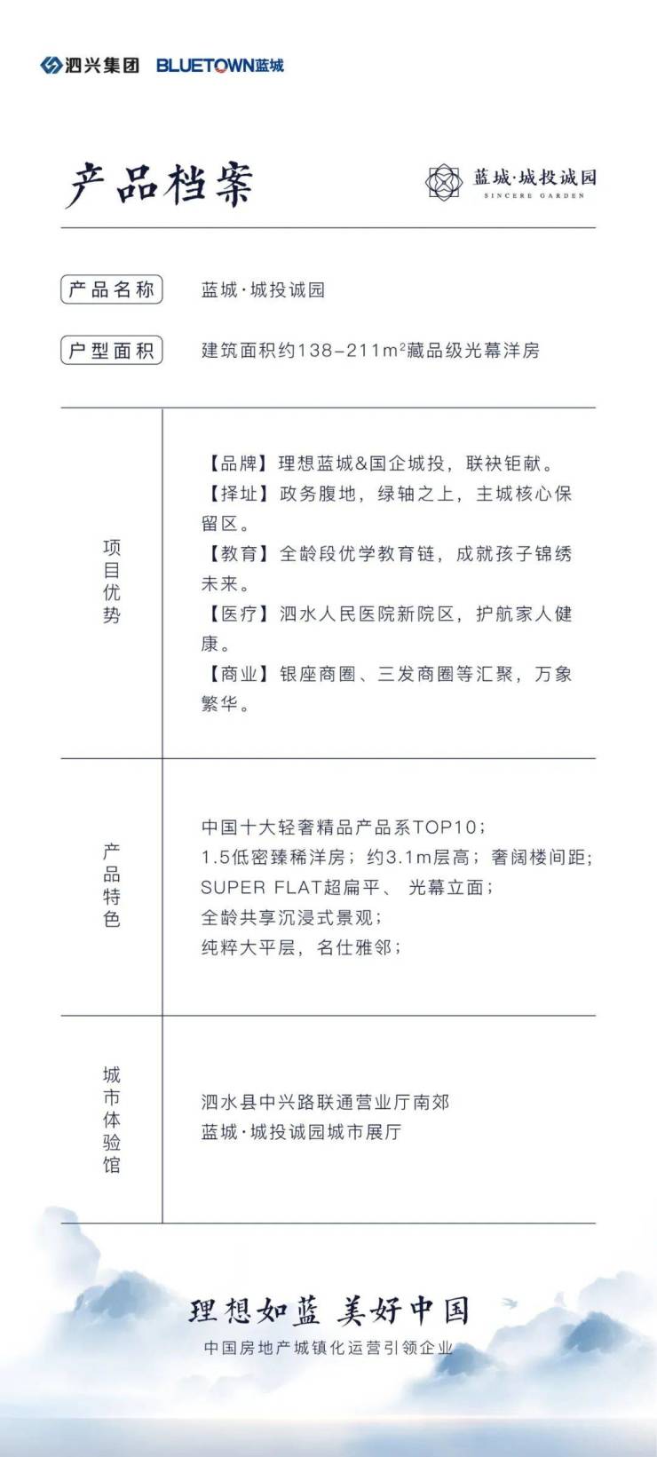 2022年,蓝城首驻泗水,带来经典诚园系作品—蓝城·城投诚园,再次演绎美好人居理想。传承蓝城匠心品质,以精工匠心,予以品质层面更高的追求,匠造生活的高级美学。
