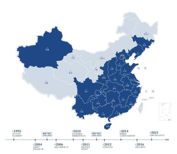 蓝城集团成立于2010年9月8日,是宋卫平先生打造理想国的再度出发,以“美好生活综合服务商”为企业愿景,秉承“仁慈普爱,真善至美”的企业核心价值观,致力于成为美好生活的引领者,截止2021年6月,蓝城中国已进驻24个省,124座城市,打造500+项目,品牌价值高达316亿。