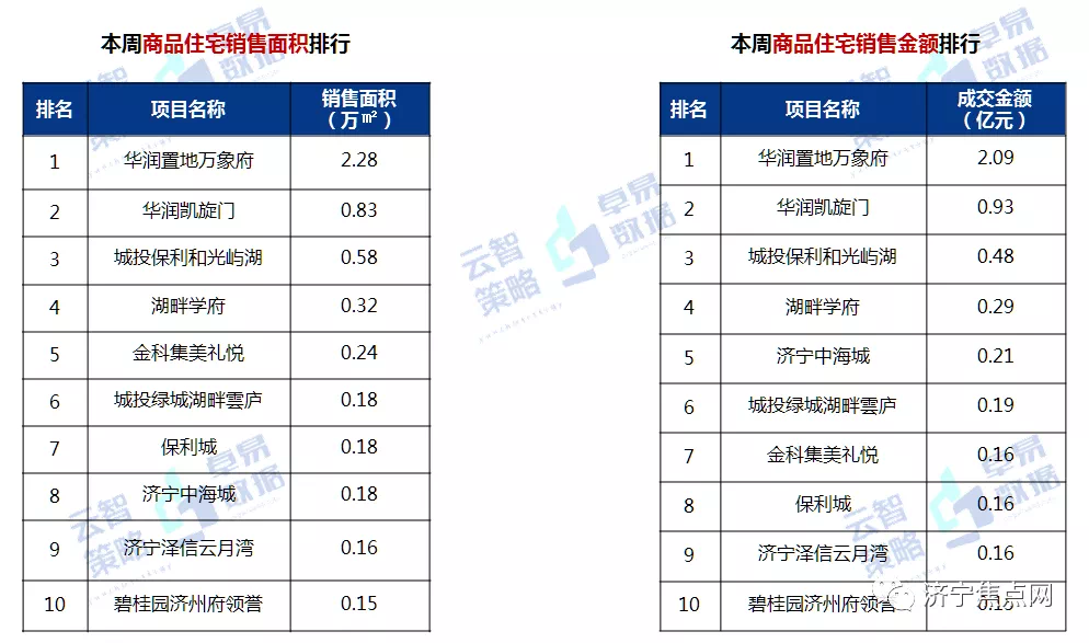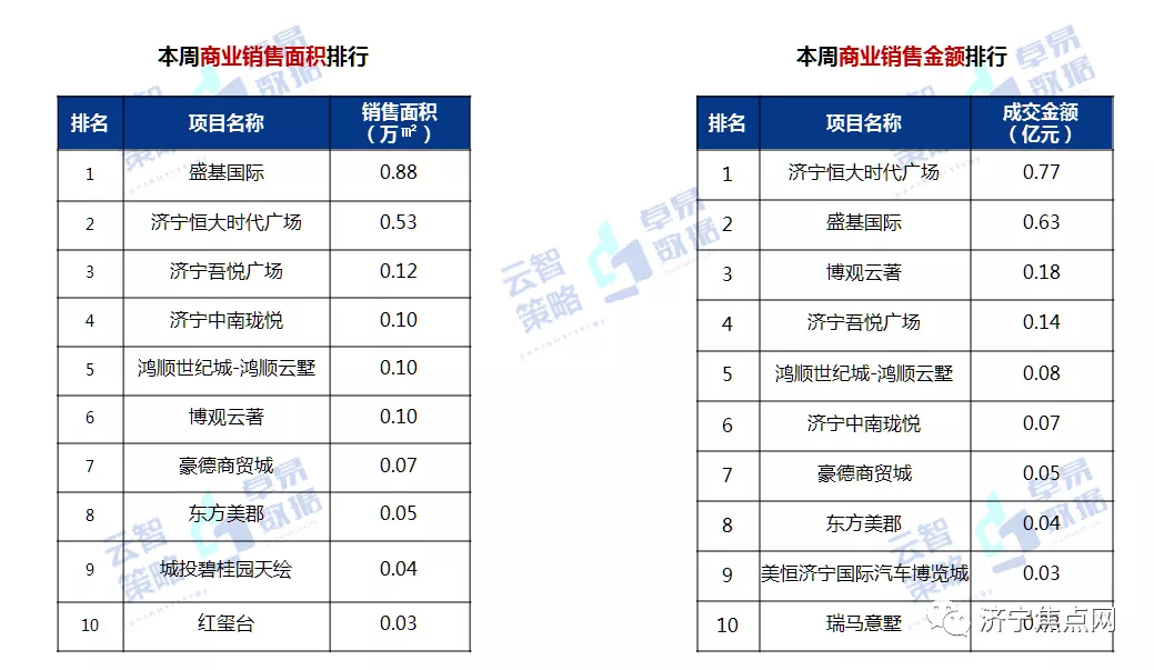 本周盛基国际项目以销售面积0.88万㎡,位居销售面积排行榜排名前列;济宁恒大时代广场以销售金额0.77亿元,位居销售金额排行榜排名前列。