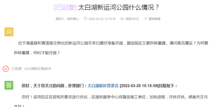太白湖新区运河公园何时能够开园?较新官方回复来了