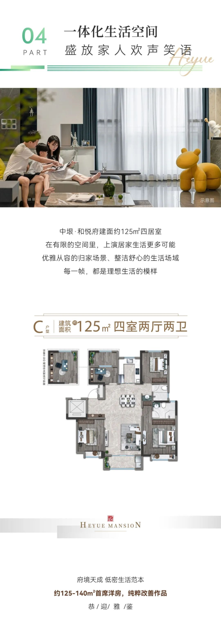 中垠·和悦府建面约125㎡四居室,在有限的空间里,上演居家生活更多可能。优雅从容的归家场景、整洁舒心的生活场域。每一帧,都是理想生活的模样。