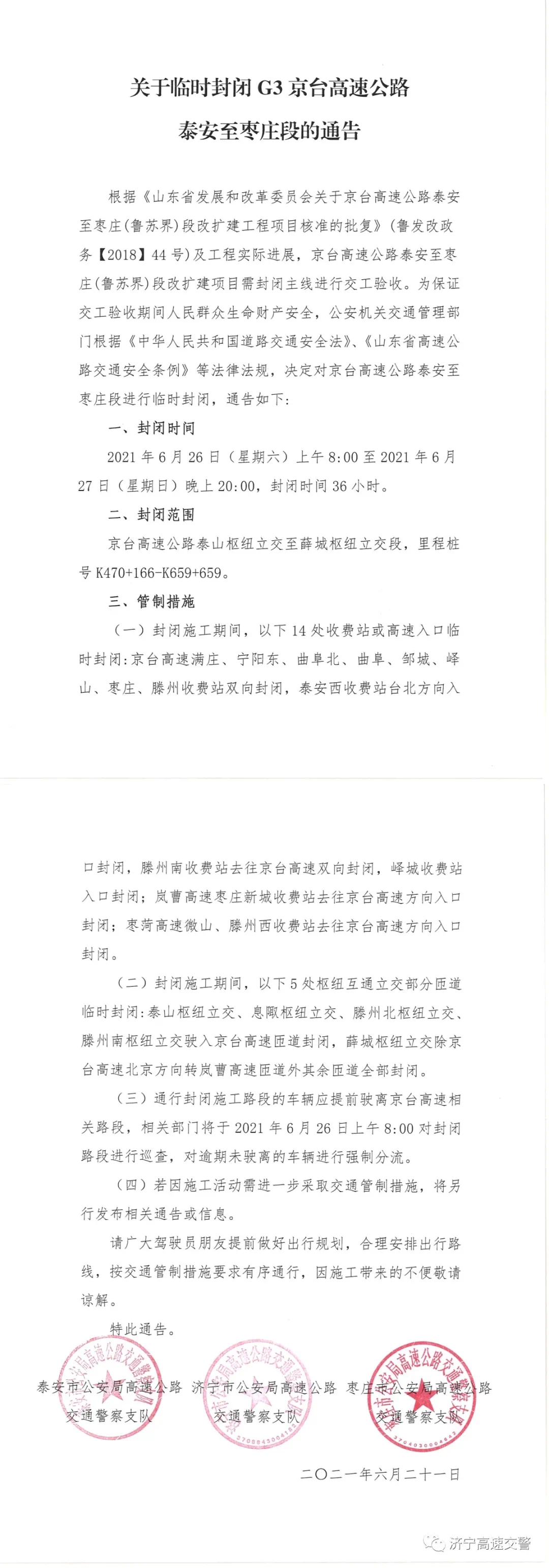 根据《山东省发展和改革委员会关于京台高速公路泰安至枣庄(鲁苏界)段改扩建工程项目核准的批复》(鲁发改政务【2018】44号)及工程实际进展,京台高速公路泰安至枣庄(鲁苏界)段改扩建项目需封闭主线进行交工验收。为保证交工验收期间人民群众生命财产安全,公安机关交通管理部门根据《中华人民共和国道路交通安全法》、《山东省高速公路交通安全条例》等法律法规,决定对京台高速公路泰安至枣庄段进行临时封闭,通告如下:
