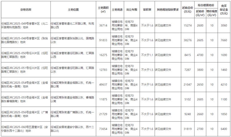 4. 任城区JRC2025-051号任兴片区(任旺路南汇翠路东)地块:2025年12月5日9时00分至2025年12月15日9时30分;