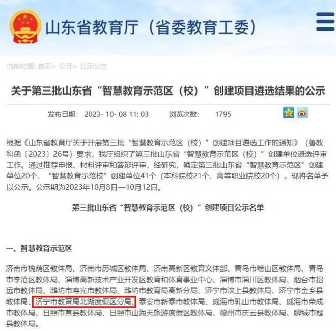 搜狐网济宁小编注意到:10月8日,山东省教育厅官网公示第三批山东省“智慧教育示范区(校)”创建项目遴选结果,确定了第三批山东省“智慧教育示范区”创建单位20个。其中太白湖新区先后通过了推荐申报、材料评审和专家答辩等环节成功入选。
