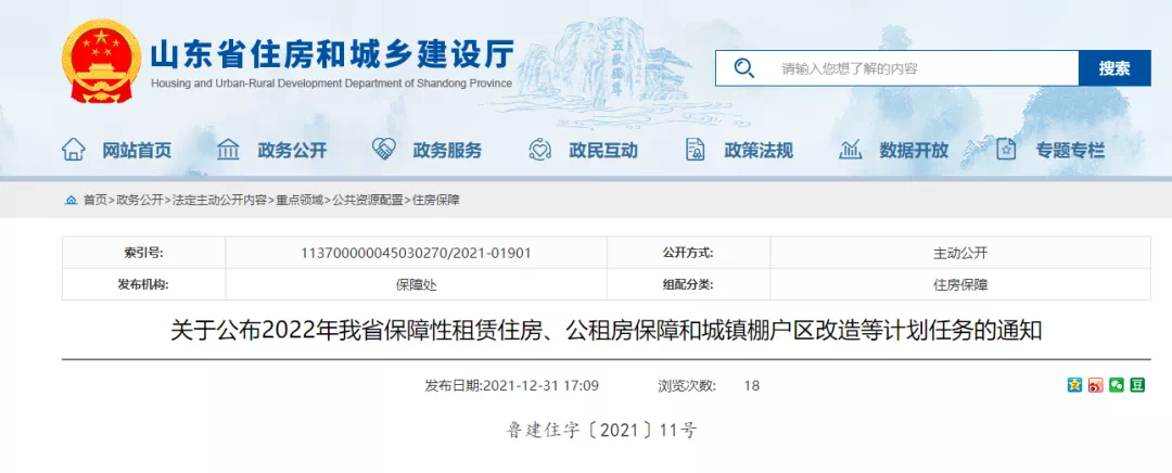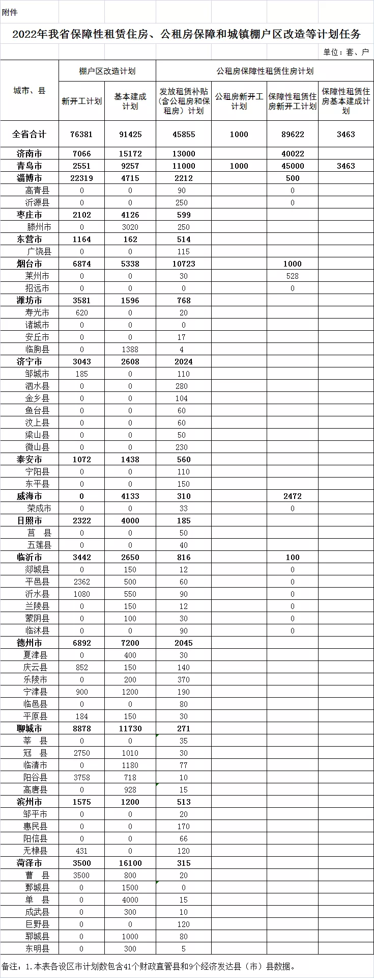 按照住房和城乡建设部办公厅等6部门《关于报送2022年保障性租赁住房、公租房保障和城镇棚户区改造等计划的通知》(建办保〔2021〕43号)要求,省住房城乡建设厅会同省发展改革委、省财政厅、省自然资源厅等部门,组织各地编报了2022年保障性租赁住房、公租房保障和城镇棚户区改造等计划。经省政府同意,确定了山东省2022年保障性租赁住房、公租房保障和城镇棚户区改造等计划,并已上报住房城乡建设部等部委纳入国家计划。现将我省各市及省财政直管县、经济发达县2022年保障性租赁住房、公租房保障和城镇棚户区改造等计划任务予以公布。请各市及省财政直管县、经济发达县在2022年1月底前公布当地2022年度计划和项目清单,抓好项目推进,确保按期完成年度任务。