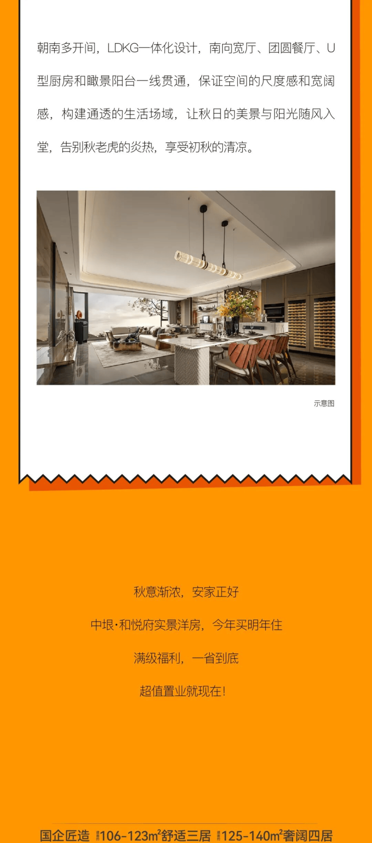 中垠·和悦府朝南多开间,LDKG一体化设计,南向宽厅、团圆餐厅、U型厨房和瞰景阳台一线贯通,保证空间的尺度感和宽阔感,构建通透的生活场域,让秋日的美景与阳光随风入堂,告别秋老虎的炎热,享受初秋的清凉。