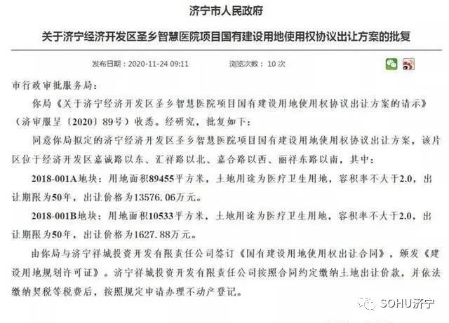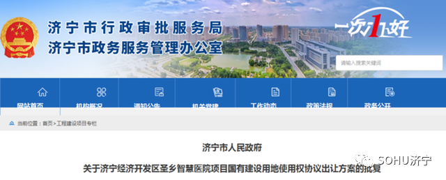 近日,济宁市人民政府对济宁经济开发区圣乡智慧医院项目国有建设用地使用权的协议出让方案做出了批复,项目总占地99988㎡(约150亩),地块出让价格为15203.94万元...