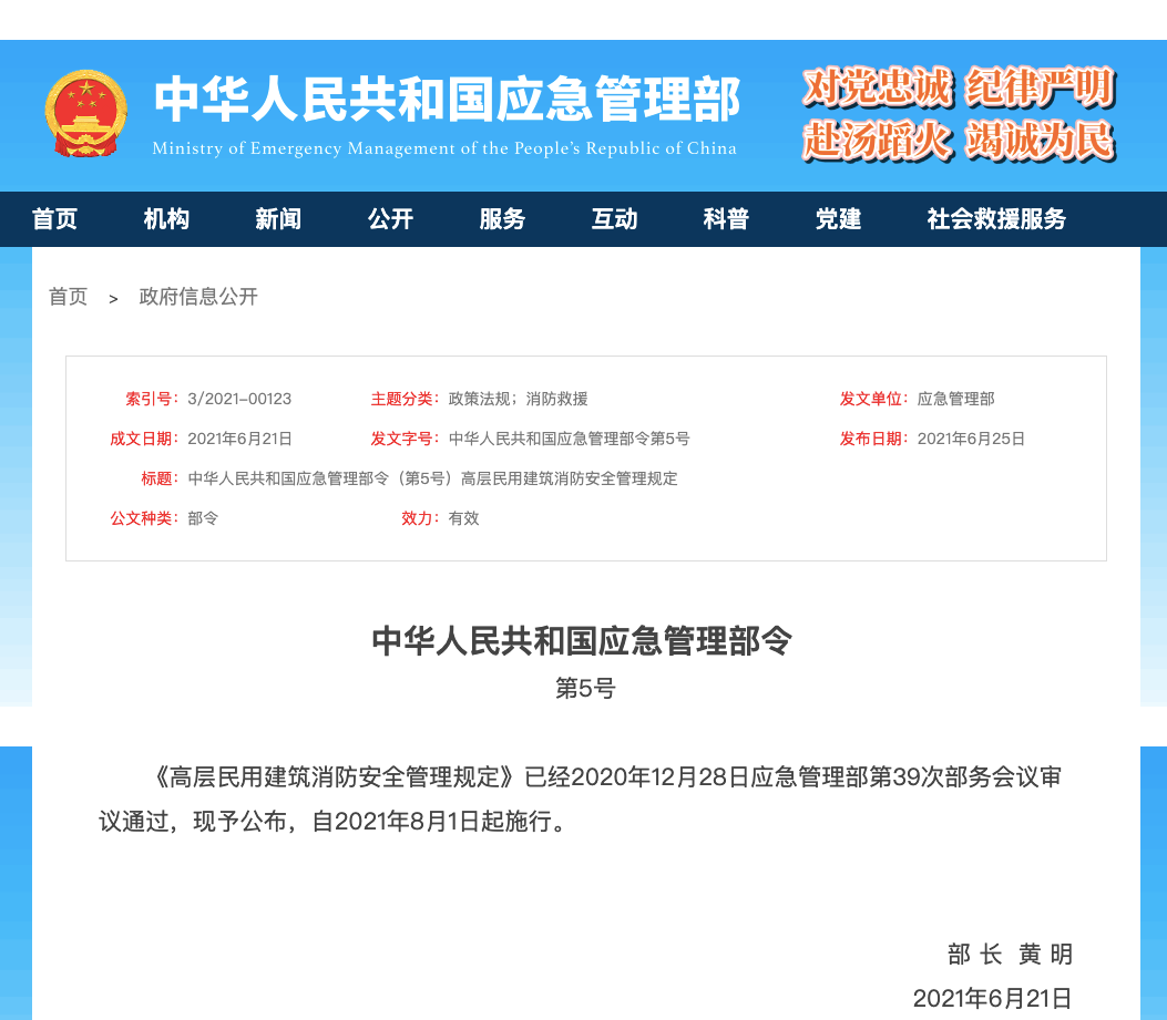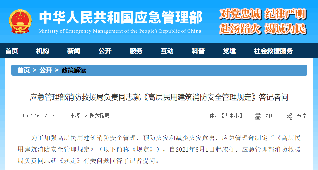 此前,中华人民共和国应急管理部公布了《高层民用建筑消防安全管理规定》(下称《规定》)。
