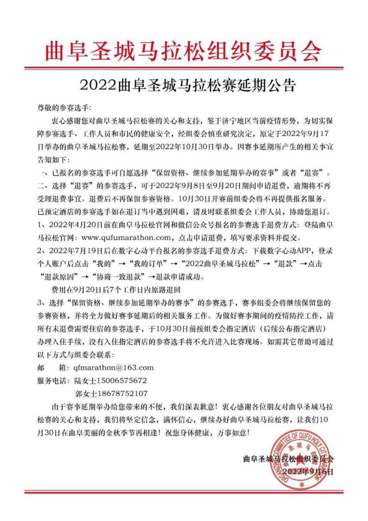 广大体育爱好者和市民们注意啦!鉴于当前疫情防控形势,2022曲阜圣城马拉松赛将延期至2022年10月30日举办,请大家相互告知!