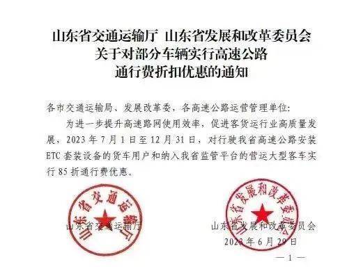 近日,山东省交通运输厅、山东省发展和改革委员会发布《关于对部分车辆实行高速公路通行费折扣优惠的通知》。 2023年7月1日至2023年12月31日,对行驶我省高速公路安装ETC套装设备的货车用户,和纳入我省监管平台的营运大型客车,实行85折通行费优惠。