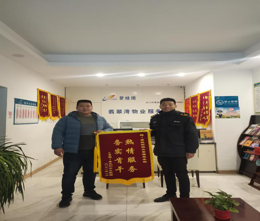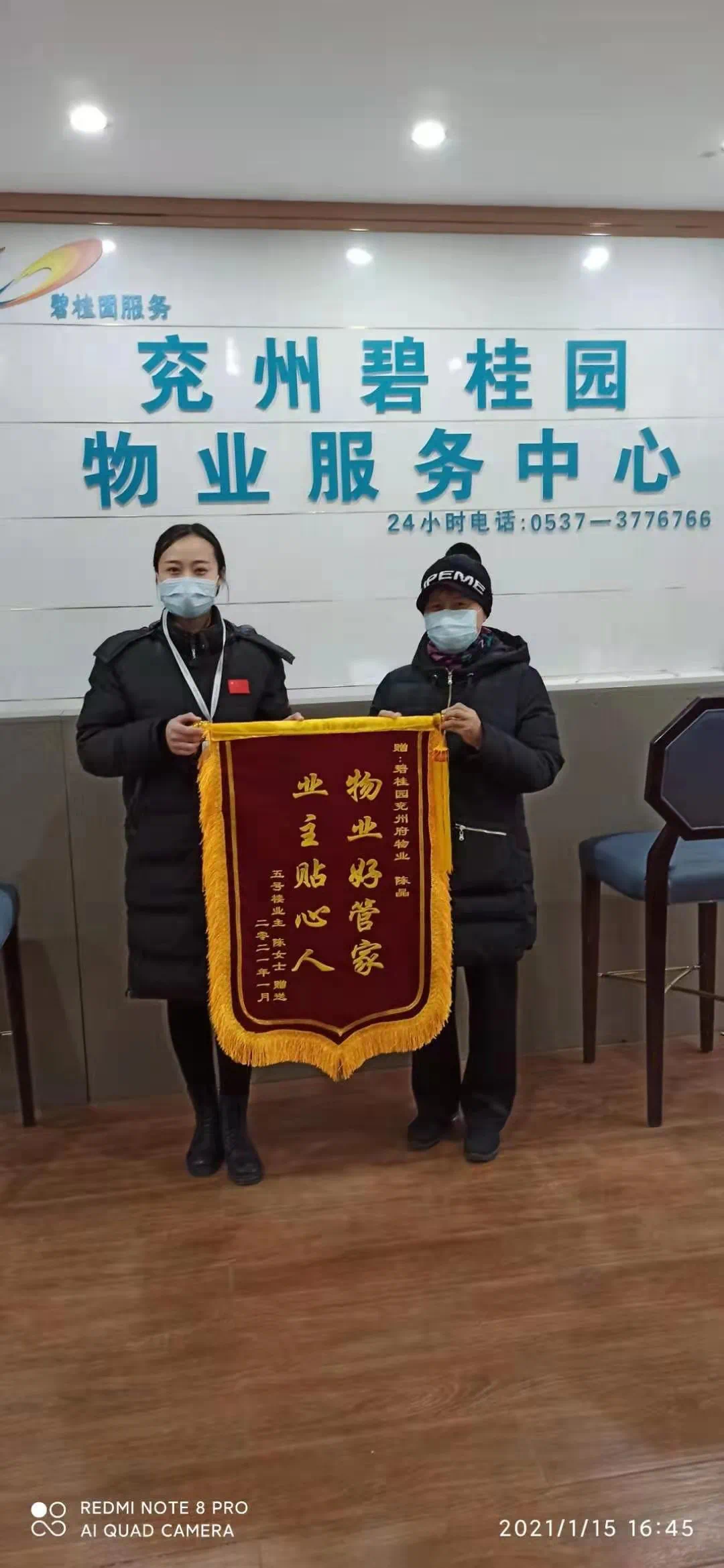 兖州碧桂园翡翠湾物管部在2021年1月23日收到了6-1-1001业主邢先生送来的锦旗,这是对翡翠湾物管部的认可、肯定,更是鼓励。2021年1月9日晚7点,6-1-1001业主家暖气漏水,工程与管家都已下班,业主联系了物管部的同事,物管同事带着工具排名前列时间前去查看。把业主家的水阀关闭后帮助业主把家中的水清扫干净并把问题发给管家联系维修。业主对物管部同事们的工作态度十分赞扬,为物管部的同事们订做了一面锦旗!