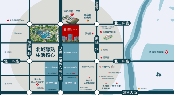 观鱼大街、湖陵三路、滨湖大道等城市主干道环伺