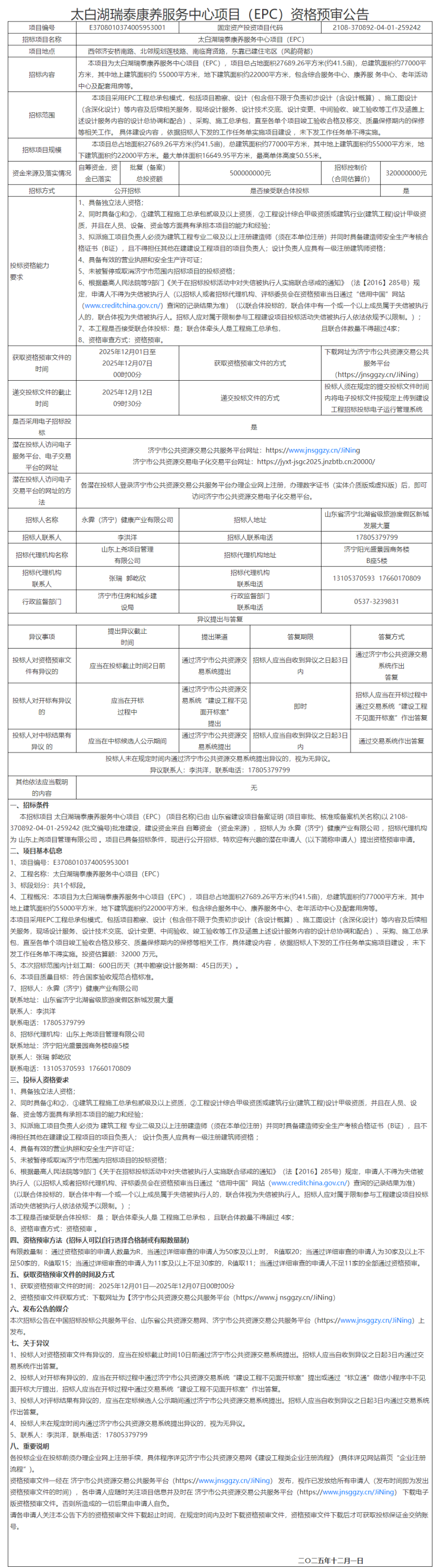 本招标项目太白湖瑞泰康养服务中心项目(EPC)(项目名称)已由山东省建设项目备案证明 (项目审批、核准或备案机关名称)以2108-370892-04-01-259242(批文编号)批准建设,建设资金来自自筹资金(资金来源),招标人为永霁(济宁)健康产业有限公司,招标代理机构为山东上尧项目管理有限公司。项目已具备招标条件,现进行公开招标,特欢迎有兴趣的潜在申请人(以下简称申请人)提出资格预审申请。