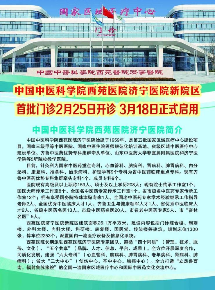 搜狐网济宁小编相关渠道获悉:2月25日,中国中医科学院西苑医院济宁医院首批门诊开诊,3月18日正式启用!
