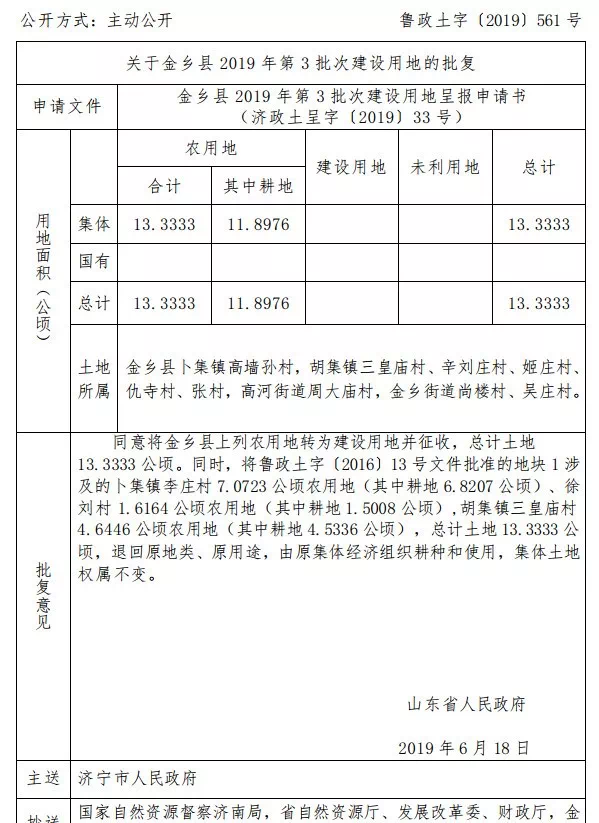 同意将金乡县卜集镇高墙孙村,胡集镇三皇庙村、辛刘庄村、姬庄村、仇寺村、张村、高河街道周大庙村,金乡街道尚楼村、吴庄村农用地转为建设用地并征收,总计土地13.3333 公顷。