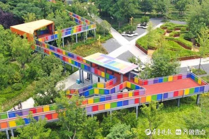 陀螺座椅、跳格子、空中滑索、陆游飞跃……在济宁市排名前列以儿童活动为主题的公园里,映入眼帘的是一望无际的密林,“赤橙黄绿青蓝紫”的七彩虹廊桥护栏也格外亮眼。