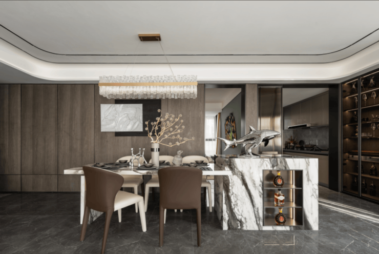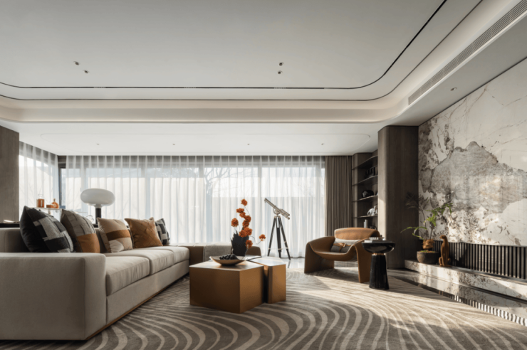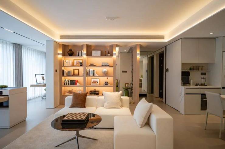 和鸣天著打破常规客厅开间布局,以约7.8米阔尺横厅搭配约270°转角窗,引自然光与城市繁华倾泻而入。无论是家庭影院、亲子游戏,还是高端社交,皆可在此展开,空间气度与生活格调浑然天成。