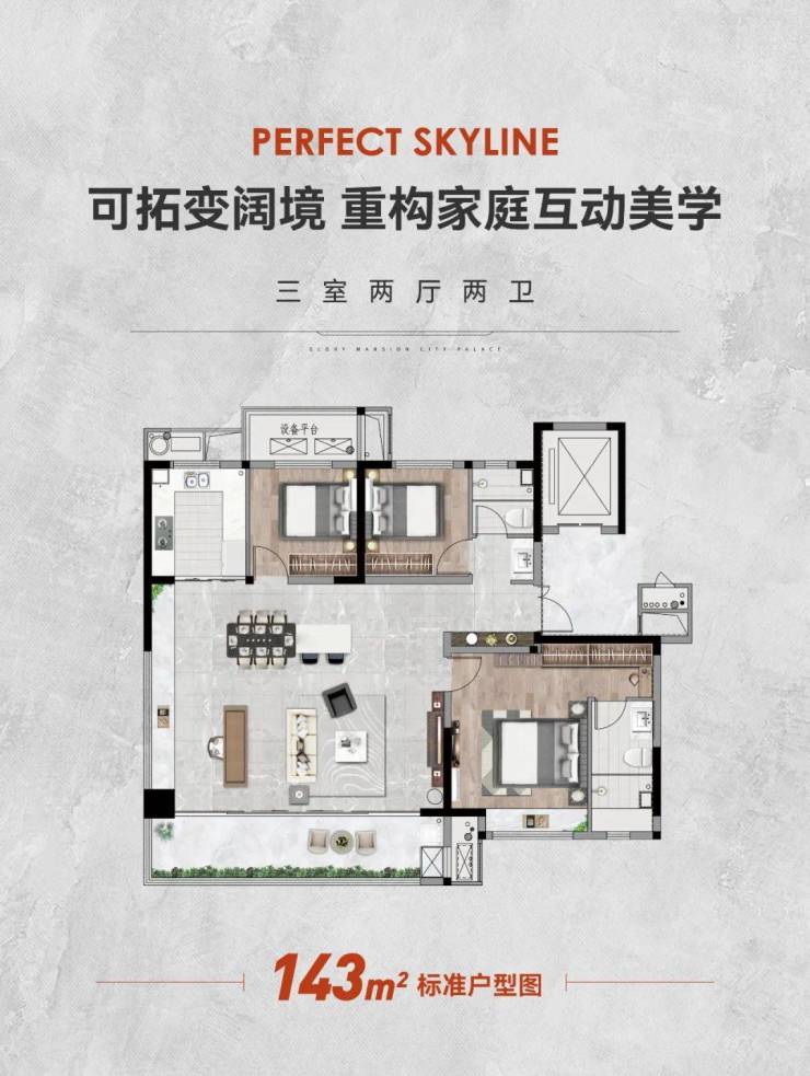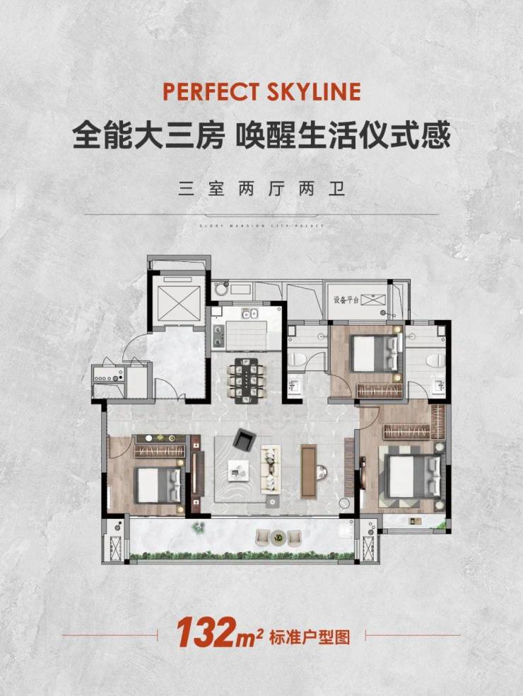 和鸣天著建面约132㎡全能大三房,突破传统观景边界,打造空间感十足的好房子。双阳台贯通客厅与次卧,延展出一方城市空中花园。晨起观景、午后品茗、孩童嬉戏、花木繁茂,生活与自然在此无缝融合,让每一寸空间都成为家庭情感的纽带。