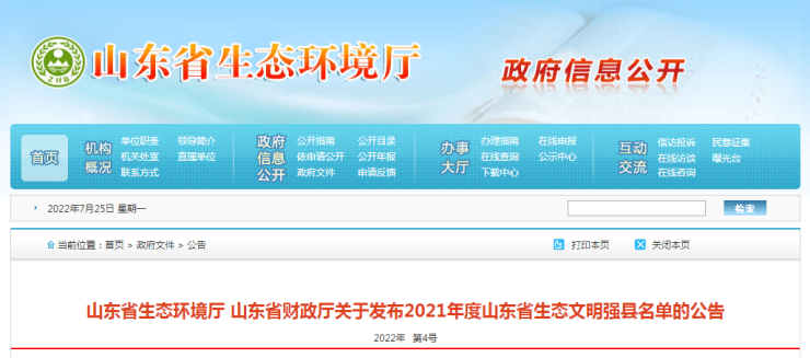 近日,山东省生态环境厅、省财政厅发布公告,公布2021年度山东省生态文明强县名单。经推荐和测评,济南市历下区、商河县、青岛西海岸新区、胶州市、烟台市莱山区、潍坊市奎文区、邹城市、荣成市、蒙阴县、齐河县等10个县(市、区)被确定为2021年度生态文明强县。