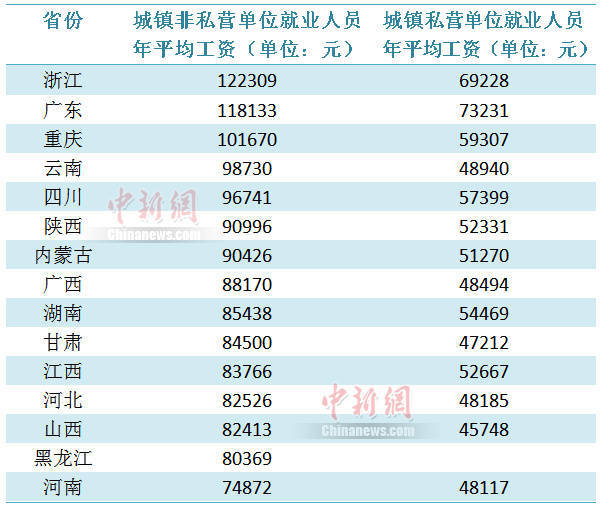 在这15个省份中,浙江、广东、重庆的城镇非私营单位就业人员年平均工资超过10万元大关。