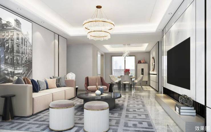 客餐厅融会贯通,外带约7米观景阳台,拓宽客厅的阔绰尺度,使整个客厅空间视野更加开阔的同时,也保证了屋内的采光通风效果,提升了整体的居住舒适度,家人休憩娱乐、会晤亲友更加从容有度。
