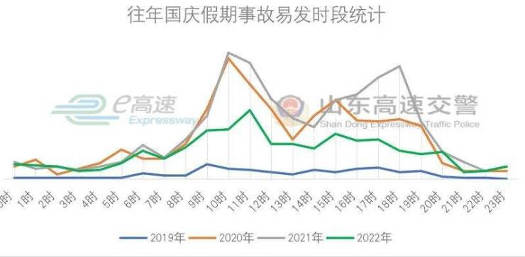 2019-2022年国庆期间每日交通事故时段分布数据显示,凌晨4-6时、上午9时至11时、傍晚17-19时是交通事故的高峰时段。根据往年假期综合数据分析,每日事故的高发时段与车流量、道路缓行情况基本一致。