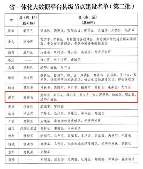 10月16日,山东省大数据局公布了第二批省一体化大数据平台县级节点建设名单,济宁市共有9个县(市、区)入选,其中嘉祥县入选提升档,兖州区、梁山县、微山县等8个县(市、区)入选基础档。