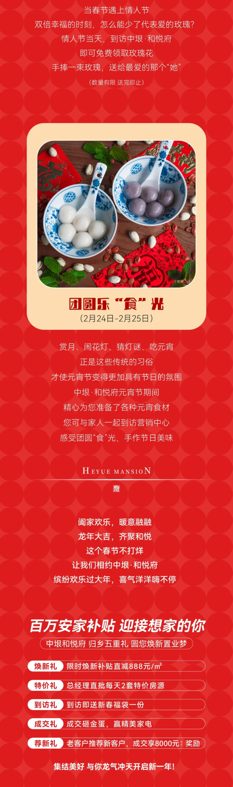 中垠·和悦府归乡五重礼,圆您焕新置业梦。限时焕新补贴直减888元/㎡,总经理直批每天2套特价房源,到访即送新春福袋一份,成交砸金蛋,赢精美家电,老客户推荐新客户,成交享8000元(税前)奖励。